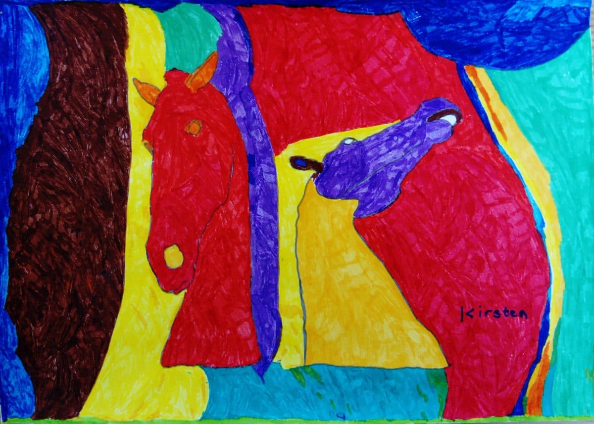 Our guide told us about the history of the project, folk lore of the Kelpies and the construction timetable before we went into the nearest Kelpie which is modelled on a Clydesdale horse called Duke. I should explain at this point that the sculptor, Andy Scott, as well as borrowing the name, Kelpies, from mythical shape-shifting beasts with the unpleasant habit of drowning unsuspecting travellers, used two real horses as muses to celebrate the history of heavy horses in the Falkirk area. Once inside Duke (the other one is called Baron) it is possible to wonder at the engineering feat of construction which, added to the artistic appreciation of the sculptures, made it a field trip to remember. Since returning class members have used their memories and digital images to create impressive works of art.